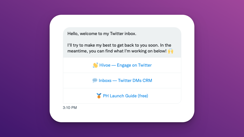 An Inbound Welcome Message is a special message that is shown to Twitter users when they open a Direct Message chat with you. This is a great way to make a first impression, and you can include links, like point them to your newsletter, personal website, SaaS websites, FAQs or support pages.